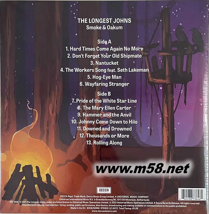 SOMOKE & OAKUM 海洋音樂民謠 黑膠(m58.net) THE LONGEST JOHNS 是一支來自英國布里斯托爾的海洋音樂團(tuán)體,成立于2015年。樂隊(duì)由John Roberts、Jonathan "JD" Darley、Dave Robinson和Robyn Sherwell組成。他們主要演繹傳統(tǒng)的英國和愛爾蘭的海洋音樂,以及創(chuàng)作自己的作品。 THE LONGEST JOHNS通過卓越的聲樂表現(xiàn)力和和諧感受深受聽眾喜愛。他們?cè)趪H上巡回演出,曾在英國、歐洲、美國等地的舞臺(tái)上獻(xiàn)唱,并受到了廣泛的贊譽(yù)。