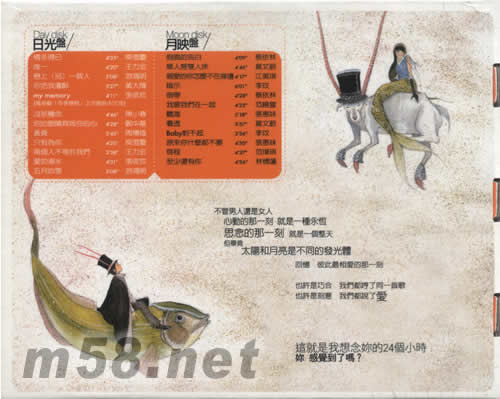 Day disk/日光盤 01. 情非得已 -庾澄慶 02. 唯一 -王力宏 03. 戀上(另)一個人 -游鴻明 04. 你把我灌醉 -黃大煒 05. my memory(電視劇[冬季戀歌]正宗插曲中文版) -張信哲 06. 沒那種命 -陳小春 07. 你的眼睛背叛你的心 -鄭中基 08. 黃昏 -周傳雄 09. 只有為你 -庾澄慶 10. 兩個人不等于我們 -王力宏 11. 愛如潮水 -張信哲 12. 五月的雪 -游鴻明 Moon disk/月映盤 01. 假面的告白 -蔡依林 02. 單人房雙人床 -莫文蔚 03. 親愛的你怎么不在身邊 -江美琪 04. 暗示 -李玟 05. 倒帶 -蔡依林 06. 我要我們在一起 -范曉萱 07. 聽海 -張惠妹 08. 看透 -莫文蔚 09. Baby對不起 -李玟 10. 原來你什么都不要 -張惠妹 11. 啟程 -范瑋琪 12. 至少還有你 -林憶蓮