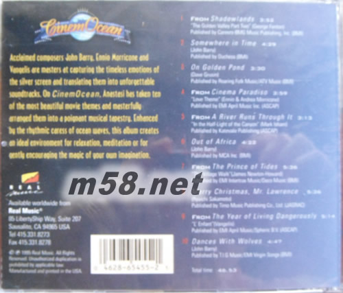 Cinem Ocean 電影海洋(m58.net) 新世紀音樂著名廠牌的realmusic,推出的這張電影海洋專輯,改編著名電影配樂大師John Barry, Ennio Morricone ,Vangelis 等為走出非洲,天堂電影院,金色池塘,時光倒轉(zhuǎn)70年,與狼共舞等經(jīng)典電影所作的配樂,在Anastasi德重新編排下,伴以陣陣海潮,是一張休閑時難得的專輯。 新世紀音樂大師安納斯塔西Anastasi,將古典樂的高貴精神,溶入新世紀音樂的領(lǐng)域,他領(lǐng)導(dǎo)其專屬的9人室內(nèi)樂樂團,重新詮釋10部雋永的電影配樂,整張專輯呈現(xiàn)出更細膩、更具現(xiàn)代感的新世紀風貌;器樂間的對位平衡與和聲效果,使每首曲子皆如藝術(shù)品般比例完美,聆賞質(zhì)量相當高,樂動間洋溢著歐洲貴族情調(diào),每一首樂章都有如蠶絲綢緞般,輕輕撩撥聽者的心靈。本專輯不論在新世紀樂壇或藝文界都受到極高的評價,Napra Review以「劇情之外的又一場美夢」來評價這張專輯,New Age Retailer更連續(xù)半年將本專輯列為新世紀推薦盤,如果你也是情感豐富的性情中人,你將會慶幸自己沒有錯過這張千金難買的好音樂。