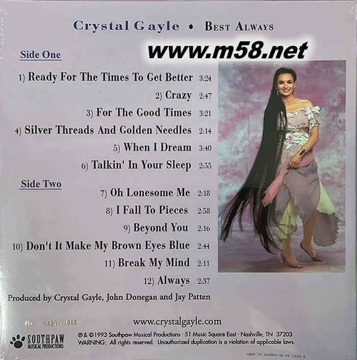 克莉絲朵蓋爾( Crystal Gayle)是以輕柔甜美的嗓音紅遍70年代至今的美國流行與鄉村樂壇的大姐大級別的歌手,因為她有一頭修長拖地的美麗金發,在國內常被人親切地稱為“長發妹”。 她演唱時全身心地投入,歌聲晶瑩,清純響亮,,感情豐富且富于磁性. Crystal Gayle不僅人長得很甜美,聲音也很有穿透力,她的歌曲中的中音區域,有種沉沉的共鳴。而《長發妹精選》又是CD圣經推薦的知名發燒天碟,因錄音水準甚佳,深受燒友喜愛。