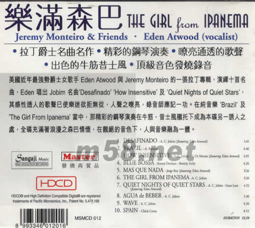 美國近年最強勢爵士女歌手,EDEN ATWOOD與JEREMY MONTEIRO的一張打西專輯,演繹十首名曲,EDEN唱出JOBIM名曲DESAFINAD,HOW INSENSITIVE 及QUIET NITHTS OF QUIET STARS,其感性透人的歌聲已使樂迷欲拒無從,人聲之嘹亮,錄音師應記一功。在純音樂BRAZIL及THE GIRL FROM IPANEMA當中,那精彩的鋼琴演奏在牛筋,昔士風襯托下成為本碟另一誘人之處,全碟充滿著浪漫之森巴情懷,在靚絕的音色下,人與音樂融為一體.