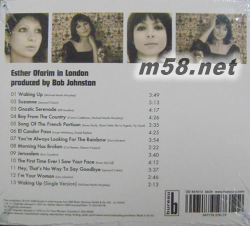 ESTHER OFARIM IN LONDON 在倫敦的伊斯特奧法琳 歐版(m58.net) 以色列猶太裔歌后[大眼妹] ESTHER OFARIM 在倫敦的 伊斯特奧法琳 本專輯于1972年在倫敦COMMAND STUDIOS灌錄,德國EMI制作,由當年炙手可熱之金牌監制BOB JOHNSTON操刀處理,他是組合SIMON & GARFUNKEL 之指定監制。碟內大部份歌曲以英語為主,與同年在德國灌錄的另一綞非英語錄音之同名專輯風格截然不同,但有異曲同工之妙。本專輯灌錄時正是ESTHER同華正盛之年;自離婚后的她,漸漸變得成熟和更有韻味,她以 實而帶有自信的聲線,嗓音清甜,技巧出眾,歌聲里充滿著是她的溫柔,情感發自她的內心,聽后甜潤感覺直達心頭!