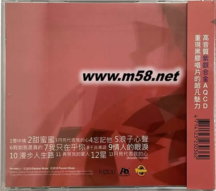 價(jià)格為估,以實(shí)到貨為準(zhǔn)! 陳潔麗 演唱鄧麗君名曲香港演唱會 / LILY - Sing Teresa Live in Hong Kong AQCD(m58.net) 華語樂壇首張以<爵士當(dāng)鋪>方式制作,現(xiàn)場即時(shí)錄音的專輯。 精湛無瑕的改編與全釋鄧麗君歌曲12首,流露出前所未有、醉人豐潤的音樂質(zhì)感,帶來十足現(xiàn)場的聆聽的享受,Clarence Chang監(jiān)製,后期母版由Leo Fung處理, 香港多家音響雜志主編、主筆及樂評人高度評介。 紫銀合金AQCD(Analog Quality Compact Disc)采用特別研發(fā)的紫色基片,以更耐熱,耐光的銀合金取代傳統(tǒng)的鋁質(zhì)表面涂層,透過精密的技術(shù)印制,減少了數(shù)字CD光盤的誤差,提高了音頻重播的精確度,無論現(xiàn)場感,平衡度與細(xì)節(jié)表現(xiàn)都有了很大的改進(jìn),音效表現(xiàn)明顯比一般CD優(yōu)勝,高音質(zhì)的紫銀合金AQCD,重現(xiàn)黑膠唱片的超凡魅力. 此唱片由Passion Misic 發(fā)行!