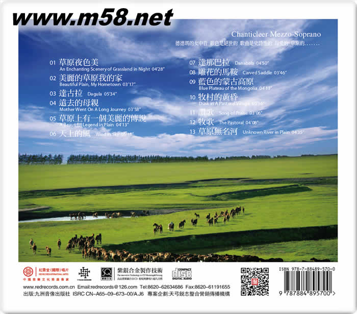 01 草原夜色美 An Enchanting Scenery of Grassland in Night 04’28” 02 美麗的草原我的家 Beautiful Plain, My Hometown 03’17” 03 達古拉 Dagula 05’34” 04 遠去的母親 Mother Went On A Long Journey 03’58” 05 草原上有一個美麗的傳說 A Beautiful Legend in Plain 04’13” 06 天上的風(fēng) Wind in Sky 05’15” 07 達那巴拉 Danabala 04’50” 08 雕花的馬鞍 Carved Saddle 03’46” 09 藍色的蒙古高原 Blue Plateau of the Mongolia 04’13” 10 牧村的黃昏 Dusk in A Pastoral Village 05’16” 11 讚歌 Song of Praise 03’06” 12 牧歌 The Pastoral 04’08” 13 草原無名河 Unknown River in Plain 04’35”