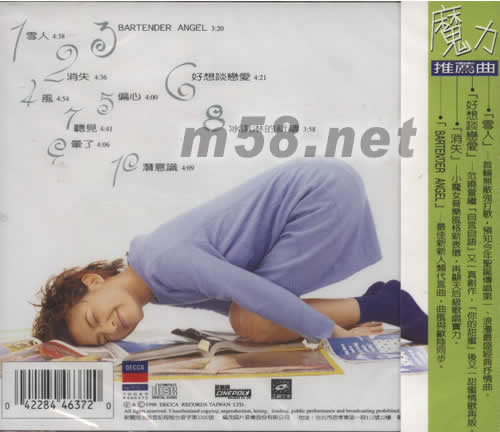 魔力 推薦曲[雪人]首輪無敵強打歌,預知今年圣誕傳唱第一\浪漫最盛經典抒情曲. [好想談戀愛]范曉萱繼[自言自語]又一真創作,[你的甜蜜]后又一甜蜜情歌再版. [消失]小魔女音樂風格新表微,再顯天后級歌唱實力. [BARTENDER ANGEL]最佳新新人類代言曲,曲風與歐陸同步.