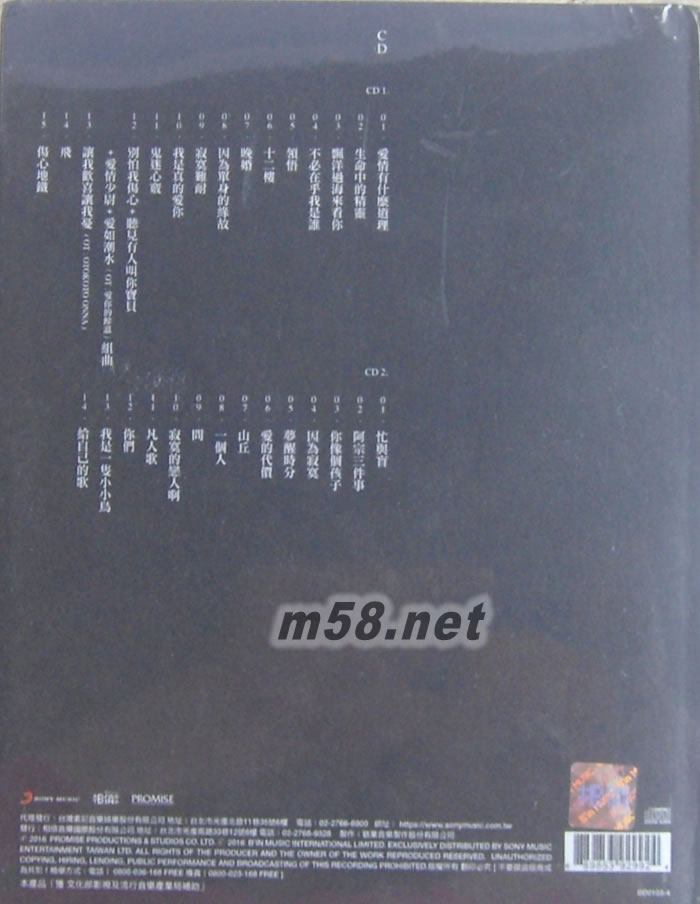 CD1曲目 01. 愛情有什么道理 02. 生命中的精靈 03. 飄洋過海來看你 04. 不必在乎我是誰 05. 領(lǐng)悟 06. 十二樓 07. 晚婚 08. 因為單身的緣故 09. 寂寞難耐 10. 我是真的愛你 11. 鬼迷心竅 12. 別怕我傷心+聽見有人叫你寶貝+愛情少尉愛如潮水(OT:愛你的余溫) 組曲 13. 讓我歡喜讓我憂(OT :OTOKOTO ONNA) 14. 飛 15. 傷心地鐵 CD2曲目 16. 忙與盲 17. 阿宗三件事 18. 你像個孩子 19. 因為寂寞 20. 夢醒時分 21. 愛的代價 22. 山丘 23. 一個人 24. 問 25. 寂寞的戀人 26. 凡人歌 27. 你們 28. 我是一只小小鳥 29. 給自己的歌