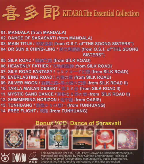 01. MANDALA(from MANDALA) 02. DANCE OF SARASVATI(from MANDALA) 03. MAIN TITLE/宋家皇朝(from O.S.T.of"THE SOONG SISTERS") 04. DR SUN&CHING-LING/孫文與慶齡(from O.S.T.of"THE SOONG SISTERS") 05. SILK ROAD/絲綢之路(from SILK ROAD) 06. HEAVENLY FATHER/天地創造神(from SILK ROAD) 07. SILK ROAD FANTASY/シルクロ一ド幻想(from SILK ROAD) 08. EVERLASTING ROAD/永遠の路(from SILK ROAD) 09. SILVER MOON/絲綢之路-黑水城の幻想(from SILK ROADⅡ) 10. TAKLA MAKAN DESERT/流ゐゐ砂(from SILK ROADⅡ) 11. MYSTIC SAND DANCE/神秘なゐ砂の舞(from SILK ROADⅡ) 12. SHIMMERING HORIZON/地平線(from OASIS) 13. TUNHUANG/敦煌かちの想ぃ(from TUNHUANG) 14. FREE FLIGHT/飛翔(from TUNHUANG)