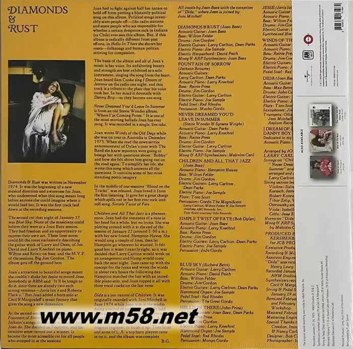民謠 DIAMONDS & RUST 鉆石的璀璨 黑膠(m58.net) 975年,加盟A&M唱片公司的瓊拜雅推出了Diamonds & Rust專輯,在主流市場(chǎng)上獲得了相當(dāng)大的成功。這張CD成為了TAS名盤之一。專輯的標(biāo)題歌曲,Diamonds and rust,被認(rèn)為是Joan Baez最出色的一首歌曲之一,是她自己的作品,這首曲子是以Baez和Dylan當(dāng)年亦師亦友的感情為主軸描寫的一段Joan自己的感情,歌詞或可說(shuō)晦澀但卻蘊(yùn)含真情。很多人以為他們倆將會(huì)舊情復(fù)燃,不過(guò)兩人只是再度同臺(tái)演出了一次,進(jìn)而激發(fā)了她完全自己譜寫的‘Gulf Winds’專輯。從此之后,她的創(chuàng)作逐漸多元化,經(jīng)常出現(xiàn)令人意外的新方向。