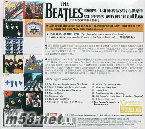 比伯軍曹寂寞芳心俱樂部 臺灣版(m58.net) ◎ 2009年流行樂壇最大盛事!披頭四The Beatles全系列專輯,全新數位錄製+影音,09.09.09全球同步發行 ◎ 以更高音質重現披頭四每首動人樂曲,首次加贈的迷你紀錄片,揭露從未曝光的「艾比路錄音室訪談Abbey Road Studio Sessions」 ◎ Digisleeve豪華包裝、首批限定!1967年第八張專輯,收錄〈Sgt. Pepper's Lonely Hearts Club Band〉、〈With a Little Help from My Friends〉、〈A Day In The Life〉...等經典單曲 2009年流行樂壇的最大盛事,首推位居史上最成功的搖滾團體、並締造出無數英美排行紀錄的「披頭四The Beatles」,將發行全系列專輯的全新數位錄製版本2009 Digital Remaster! 全球唱片銷售直逼十億張,全英史上最多冠軍專輯的搖滾樂團,全美史上專輯銷售最高的搖滾樂團,榮登滾石雜誌Rolling Stone與全美告示牌雜誌Billboard「史上百大歌手」首位、名列時代雜誌Time「20世紀最偉大人物」之一...披頭四不但改寫定義60年代的流行音樂,更深深影響后代的每個杰出音樂人。 13張披頭四的歷年經典與一張雙碟精選輯,在2009全新數位錄製的版本中,不但經過最新科技處理、以更高音質重現披頭四每首動人樂曲,並且透過在每張專輯里、所附贈Quicktime格式的迷你紀錄片,將帶領樂迷見證從未曝光過的「艾比路錄音室訪談Abbey Road Studio Sessions」!此外,在此次系列發行的「首批」專輯,更採左右對開的Digisleeve豪華包裝,完美典藏專輯CD以及加贈珍稀照片與背景說明的精美寫真。 在這張首次於1967年發行的《比伯軍曹寂寞芳心俱樂部Sgt. Pepper's Lonley Hearts Club Band》中,收錄〈Sgt. Pepper's Lonely Hearts Club Band〉、〈With a Little Help from My Friends〉、〈A Day In The Life〉等經典單曲。這張堪稱為前所未有的曠世鉅作,不僅詞曲皆佳,更開創出全新感受。包括封面設計成為日后的一門藝術、為錄音技術的樹立新典范、將專輯視為整體概念創作、歌曲之間採用Non-Stop銜接錄音。更值得一提的是,這張專輯所散發出的反傳統思維,給了60年代青年們「另一種」的思考方向:一種對傳統威權的不滿,一種對自由氣息的爭取。