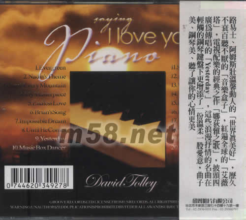 1.EVERGREEN 2.NADIA'S THEME 3.CHMB E VERY MOUNTAIN 4.MY MASTERPIECE 5.ENDLESSLOVE 6.BRIAN'S SONG 7.IMPOSSIBLE DREAM 8.UNTIL HE COMES 9.YESTERDAY 10.MUSIC BOX DANCER 11-20……