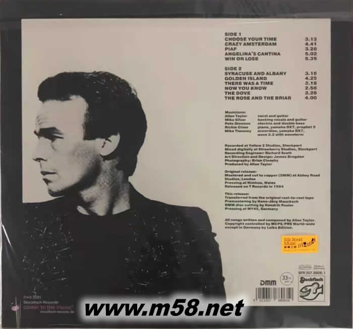 模擬的魅力「黑珍珠」系列第六輯 贏與輸 [Win or Lose] Analog Pearls Vol. 6 黑膠(m58.net) 1. 被譽為吟游詩人及完美唱作天皇的阿倫.泰勒(Allan Taylor)以其沉實雄渾,感性中帶著風霜的聲線征服了無數樂迷,配合冼煉的歌唱技巧,被視為「發燒男聲」之翹楚,雄視樂壇超越五十年。 2. 泰勒與發燒錄音名牌「老虎魚(Stockfisch Records)」合作達二十五年,共同創造出多個使樂迷津津樂道的經典專輯,是高質素美樂錄音的保証。泰勒在其音樂旅程穩定基石后的初期,曾於一九八四年親自以模擬錄音方式(analog recording)製作專輯《Win Or Lose (贏取或輸掉)》,在當時出版后無論是歌曲的動聽性,他唱功的表現和錄音效果皆獲得好評如潮。他為了與「老虎魚」的合作達入新的里程碑,與錄音大師古達‧普勒(Günter Pauler)商討,由泰勒提供這專輯的原裝模擬母盤,而普勒採用最新的技術和器材加以復修和改良使整體音效得以提升后再作出版,使更多樂迷能有機會欣賞泰勒在風華正茂時令人回味無窮的歌聲和令人讚嘆不已的指彈技術。 3. 專輯內的十一首歌曲全是泰勒的精心杰作,由他親自演繹更為傳神,配合多位當時能獨當一面的音樂人絲絲入扣的演奏緊密地配合,每首樂曲皆以賞心悅耳的形態展現,將他獨有的魅力詮釋得淋漓盡致。 4. 普勒製作的母盤使原有音色得以保存時亦加以潤飾,無論是人聲或樂器聲的原來音色得已原汁原味地寄存。現以金屬直刻母盤(Direct Metal Master),180克處女黑膠盤為載體,原來音源的模擬音色更為清麗飽滿,樂器音質厚實,線條分明,人聲細致真實,是愛好聆聽模擬錄音者另一必備之選。
