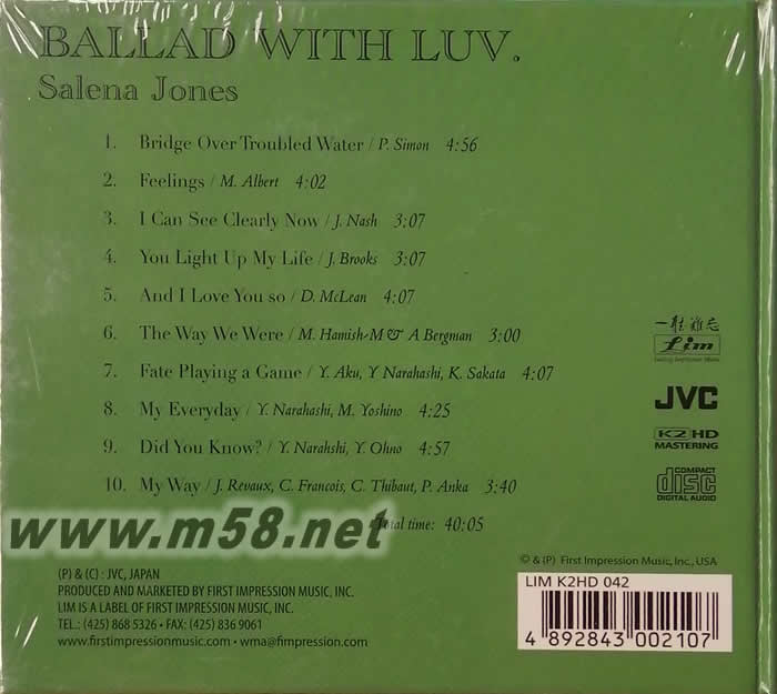 愛(ài)的情歌 BALLAD WITH LUV K2HD(m58.net) 著名黑人女歌手賽琳娜瓊斯的《愛(ài)的情歌》。Fim用K2 HD技術(shù)再版JVC原始模擬母帶,音效更上一層樓! 賽琳娜瓊斯1944年1月29日出生在美國(guó)弗吉尼亞州的新港。她從小就醉心于爵士樂(lè)歌唱,很早就在自己的家鄉(xiāng)開(kāi)始了歌唱生涯。賽琳娜瓊斯有著一副似乎是煙熏火燎過(guò)的暗淡但又極具磁性的獨(dú)特嗓子,寬厚而共鳴豐富的嗓音而獨(dú)具魅力!在樂(lè)壇馳騁30多年的賽琳娜瓊斯,對(duì)各種音樂(lè)風(fēng)格都能夠駕馭自如的,無(wú)論是演唱具有神秘韻致的新創(chuàng)歌曲,還是予人超凡美感的情歌,甚至是搖擺化的節(jié)奏歌曲,賽琳娜瓊斯都能以自己真誠(chéng)、親切的詮釋風(fēng)格贏得大家的喜愛(ài)。她甚至被比肩為爵士天后Ella Fitzgerald。 《愛(ài)的情歌》原本是JVC的專(zhuān)輯,日本JVC的唱片一向以制作精良,音色溫暖著稱(chēng)。如今Fim公司推出效果更佳的K2 HD發(fā)燒版本,無(wú)異于爵士樂(lè)迷的福音。 這張專(zhuān)輯收錄的全部是經(jīng)典名曲,聆聽(tīng)賽琳娜瓊斯的演繹,則另有一番不同的滋味
