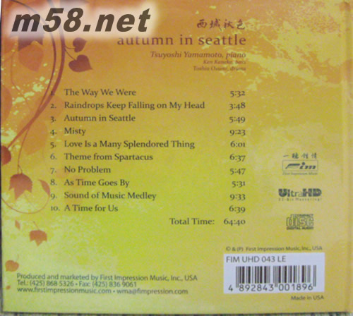 西城秋色AUTUMN IN SEATTLE ULTRAHD 限量版(m58.net) 瘋魔國際之日本爵士鋼琴家YAMAMOTO,25年前所錄奏之THE WAY WE WERE ,MISTY等名同,其扣人心統這演譯及音色,迄今無出其右!今得FIM盛情邀請,於去年重新錄奏。他經過歲月生活及感情之洗練,把首本名曲演譯得更入要三分, 使聽者倍感共鳴。
