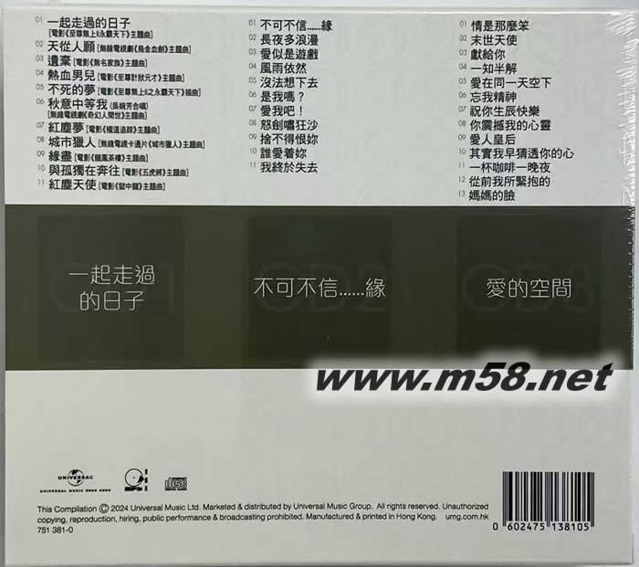 DISC 1: 一起走過的日子 單曲 歌名 歌手 1 一起走過的日子 [電影《至尊無上II永霸天下》主題曲] 劉德華 2 天從人愿 [無線電視劇《烏金血劍》主題曲] 劉德華 3 遺棄 [電影《無名家族》主題曲] 劉德華 4 熱血男兒 [電影《至尊計狀元才》主題曲] 劉德華 5 不死的夢 [電影《至尊無上II之永霸天下》插曲] 劉德華 6 秋意中等我 [無綫電視劇《奇幻人間世》主題曲] 劉德華/ 吳婉芳 7 紅塵夢 [電影《極度追縱》主題曲] 劉德華 8 城市獵人 [無綫電視卡通片《城市獵人》主題曲] 劉德華 9 緣盡 (相愛沒緣份) [電影《龍鳳茶樓》主題曲] 劉德華 10 與孤獨在奔往 [電影《五虎將之決裂》主題曲] 劉德華 11 紅塵天使 [電影《獄中龍》主題曲] 劉德華 DISC 2: 不可不信…緣 單曲 歌名 歌手 1 不可不信…緣 [電影《九一神鵰俠侶》主題曲] 劉德華 2 長夜多浪漫 劉德華 3 愛似是游戲 劉德華 4 風(fēng)雨依然 劉德華 5 沒法想下去 劉德華 6 是我嗎?! 劉德華 7 愛我吧! 劉德華 8 怒劍嘯狂沙 [無綫電視劇《怒劍嘯狂沙》主題曲] 劉德華 9 捨不得恨你 劉德華 10 誰愛著你 劉德華 11 我終于失去 劉德華 DISC 3: 愛的空間 單曲 歌名 歌手 1 情是那麼笨 劉德華 2 末世天使 劉德華 3 獻(xiàn)給你 劉德華 4 一知半解 劉德華 5 愛在同一天空下 劉德華 6 忘我精神 劉德華 7 祝你生辰快樂 劉德華 8 你震撼我的心靈 [無綫電視劇《巨人》主題曲] 劉德華 9 愛人皇后 劉德華 10 其實我早猜透你的心 劉德華 11 一杯咖啡一晚夜 劉德華 12 從前我所緊抱的 劉德華 13 媽媽的臉