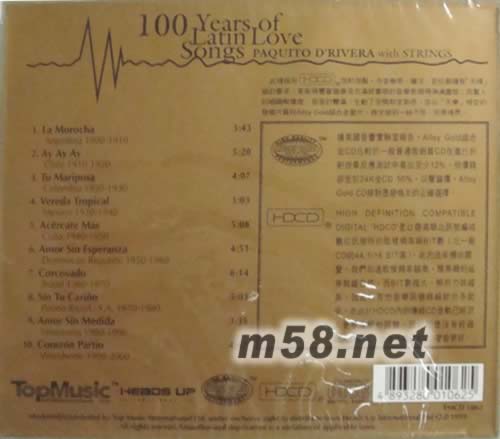 拉丁情歌100 Years Of Latin Love Songs(m58.net) Paquito Drivera 專輯介紹:世界級薩克斯大師Paquito D' Rivera的這張專輯,收錄了10首曲子,每首都有雙重的代表性。第一“重”是代表了20世紀每一個10年里最流行的拉丁情歌;第二“重”則是代表了每個地域/國家的不同風格。也就是說,在短短的46分鐘,這里的音樂足以讓你神游多個中美及南美國度,感受熱情洋溢的拉丁風情。