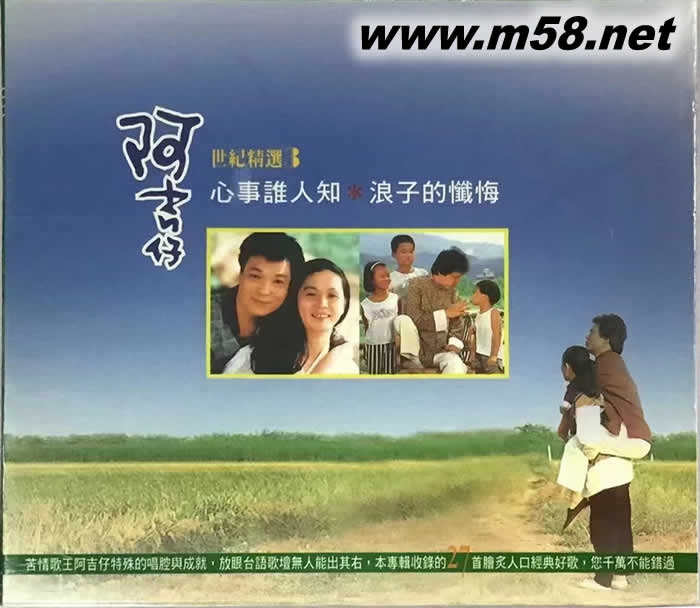 阿吉仔世紀精選第3集 2CD心事誰人知.浪子的懺悔(m58.net) 阿吉仔:阿吉仔那低沈深情柔婉悲戚的歌聲,他唱出臺灣人數十年的悲哀。阿吉仔的歌聲刻意控制得很低沈很柔,最有感情、最快樂的阿吉仔:「頂港音 下港調 阿吉仔為你唸唱上界懷念的臺灣歌謠」。阿吉仔在舞臺上靠著板凳一步一步撐到舞臺中央、唱歌時痛苦的表情及悲慘的聲調都令人動容難忘。由金圓唱片制作的,絕對是阿吉仔歌唱生涯的最佳代表作。由他渾厚有力的嗓音詮釋多首臺灣歌謠,不論是失去愛情、希望破碎、生活艱困還是思念故鄉,都十足扣人心弦。每一首歌的前奏音樂下,還有阿吉仔感性的「口白」,先為你「念」一段這首歌曲的背景與故事作為前奏,感情深刻溢于言表!早已絕版多時的「念歌」,絕對是發燒友珍藏的首選!