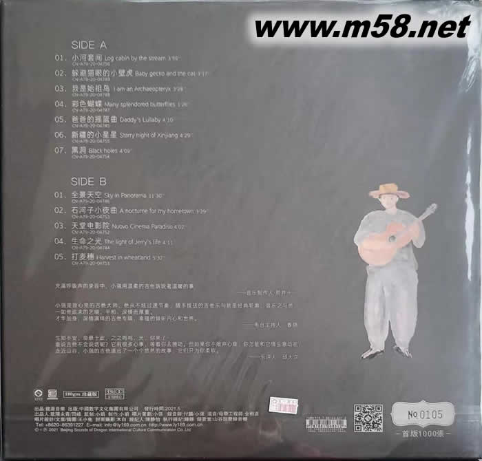 生命之光 山谷小強 吉它手 小娟&山谷里的居民 黑膠(m58.net) 演奏/策劃 小強 錄音 付鵬/小強 混音/母帶工程師 全相彥 監制/制作人 小娟 山谷里的民謠吉它手:小強。山谷風跟山谷里的空氣一樣爽。 這一次,山谷小強配角變主角,出吉它專輯了。12首作品,是從他的靈感曲庫中精心挑選出來的曲目。這里有生活,有溫柔,有力量,全部都是發自心底最真實自在的樂音。 一把吉他,對每一個人的意義不同,吉他對于小強而言就是他的世界,他用吉他表達生命和生活,精彩與熱愛,他用吉他去詮釋探究世界的一切,第一張唱片承載著他獨特的個人氣質,每一把吉他都是不同的,有古典的、溫暖的、熱情的...而小強的吉他就是屬于他自己的獨特表達,沒有人可以復制。