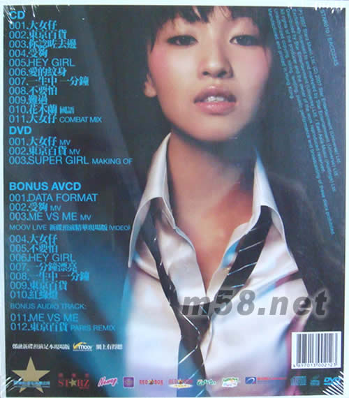 CD 01. 大女仔 02. 東京百貨 03. 你諗咗去邊 04. 受夠 05. HEY GIRL 06. 愛的紋身 07. 一生中 一分鐘 08. 不要怕 09. 難過 10. 花木蘭 國語 11. 大女仔 COMBAT MIX DVD 01. 大女仔 MV 02. 東京百貨 MV 03. SUPER GIRL MAKING OF BONUS AVCD 01. DATA FORMAT 02. 受夠 MV 03. ME VS ME MV MOOV LIVE新碟預演精華現場版(VIDEO) 04. 大女仔 05. 不要怕 06. HEY GIRL 07. 一分鐘漂亮 08. 一生中一分鐘 09. 東京百貨 10. 紅綠燈 BONUS AUDIO TRACK: 11. ME VS ME 12. 東京百貨 PARIS REMIS
