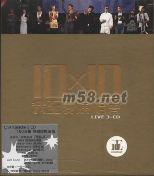 10 X 10 我至愛演唱會(m58.net) LIVE KARAOKE 3-CD 160分鐘 熱唱經典金曲 張學友 首度演繹[最佳損友] 陳慧琳[愛與痛的遺緣] 陳奕迅+張學友[熱辣辣] 孫耀威+謝安琪[相愛很難] 陳小春+葉文輝[真的愛你] 林苑[眼淚](國) 關楚耀[冷雨夜] BAND SOUND:許志安[歲月無聲]/劉浩龍 [大地]/蘇永康[紅色跑車] 大合唱:[一生一火花] 特別嘉賓:譚詠麟 許志安 蘇永康