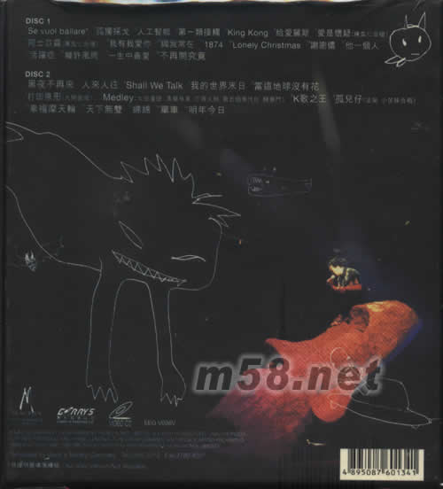 DISC 1 1、SE VOUL BALLARE 2、孤獨(dú)探戈 3、人工智能 4、第一類接觸 5、KING KONG 6、給愛麗斯 7、愛是懷疑 8、阿士匹靈 9、我有我愛你 11、1874 12、LONELY CHRISTMAS 13、謝謝儂 14、他一個(gè)人 15、活躍癥 16、幾許風(fēng)雨 17、一生中最愛 DISC 2 1、不再問究竟 2、黑夜不再來 3、人來人往 4、SHALL WE TALK 5、我的世界末日 6、當(dāng)這地球沒有花 7、打回原形(大開眼戒) 8、MEDLEY---太空漫游/美麗有罪/打得火熱/第五個(gè)現(xiàn)代化/隨意門 9、K 歌之王 10、孤兒仔 11、幸福摩天輪 12、天下無雙 13、綿綿 14、單車 15、明年今日