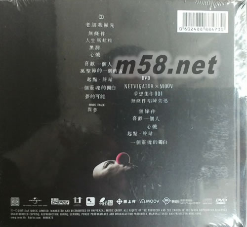 CD1.老細我撇先 2.無條件 3.人生馬拉松 4.黑洞 5.心燒 6.喜歡一個人 7.萬圣節的一個傳說 8.起點‧終站 9.一個靈魂的獨白 10.夢的可能Bonus Track 11.異夢CD1.老細我撇先 2.無條件 3.人生馬拉松 4.黑洞 5.心燒 6.喜歡一個人 7.萬圣節的一個傳說 8.起點‧終站 9.一個靈魂的獨白 10.夢的可能Bonus Track 11. 異夢Netvigator x MOOV夢想集作001無條件唱陳奕迅 DVD 1.無條件 2.喜歡一個人 3.心燒 4.起點‧終站 5.一個靈魂的獨白