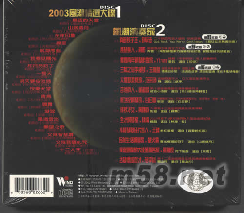 2003風潮大碟 DISC 1 1、最近的天堂/選自[最近的天堂] 2、山居歲月/選自[山居歲月] 3、左岸印象/選自[左岸印象] 4、晨星/選自[流動的城市] 5、航海序曲/選自[VU VU的故事] 6、我看風曙光/選自[漫步在云端] 7、和月亮約了/選自[住海邊] 8、一整天/選自[自己的房間] 9、明天要按怎過/選自[明天要按怎過] 10、快樂天堂/選自[我的快樂天堂] 11、青島/選自[活力綠水晶] 12、邀舞/選自[熱情紅水晶] 13、凝翠/選自[茶禪一味] 14、風清云淡/選自[心云清湯] 15、原望之歌/選自[原望之歌] 16、文殊智慧贊/選自[薩迦法王文殊禮贊] 17、文殊心咒/選自[歡喜文殊咒] 18、十二天王(壯族)/選自[這山唱那山] 風潮演奏家 DSIC 2 1、陶笛孩子王,游學志/二十余把陶笛大編制 快樂登場 搶鮮收錄 (GOD REST YOU MERRY GENT LEMAN[最佳女主角廣告曲]) 2、琵琶美聯社人 蔣 彥/金曲將得主林海全力打造 搶鮮收錄 (弄云[再度顛覆東方器樂刻板印象 展現琵琶另類風貌]) 3、韓國青年鋼琴作曲家 YIRUMA/韓劇《冬季戀歌》感人配樂原作(愛我選自[初戀]) 4、三橘之戀手風琴 王雁盟/優質手風琴手 微醺上路 搶先收錄 (微醺的步態 (流浪的故事 漂泊的靈魂 住在手風琴里面) 5、大提琴美食家 范宗沛/金曲制作人 亞太電影配樂得主(舞 選自[故事]) 6、吉他詩人 董運昌/第十屆金曲獎最佳演奏專輯得主 (紅色小酒館 選自[第33個街角轉彎]) 7、新世紀鋼琴家 白日夢/在韓國排行榜上打敗珍妮佛羅培茲、新好男孩、恩雅等人 (眼淚 選自[白日夢]) 8、提琴才女 黃雅詩/入圈第十三屆金曲獎最佳演奏專輯 (對話 選自[蝶舞]) 9、全才鋼琴家 林海/2002年創下3張作品同時入圍金曲獎記錄(嬉戲 選自[林海·貓]) 10、水晶琴最佳代言人 王瑋/粉紅落櫻 選自[真愛粉紅晶] 11、自然生鋼琴家 螢火蟲/陽光燦爛的日子 選自[山居歲月] 12、享譽國際的大陸笛蕭名家 張維良/月下飄香 選自[茶雨] 13、古琴樂壇奇才 范李彬/第十二屆金曲將最佳民族樂曲專輯得主(關山月 選自[關山月])