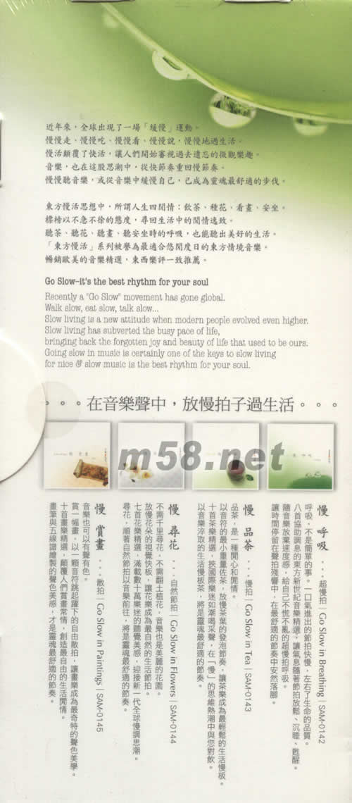 東方慢活4CD套裝(m58.net) [慢,是靈魂最舒適的節(jié)奏] 呼吸的最小半單位,是在茶水入口前,抬眼望向窗邊畫(huà),并在凝眼的剎那,被飛經(jīng)的粉蝶引向庭前的小花。 慢活四帖 :慢呼吸、慢品茶、慢尋花、慢賞畫(huà)。
