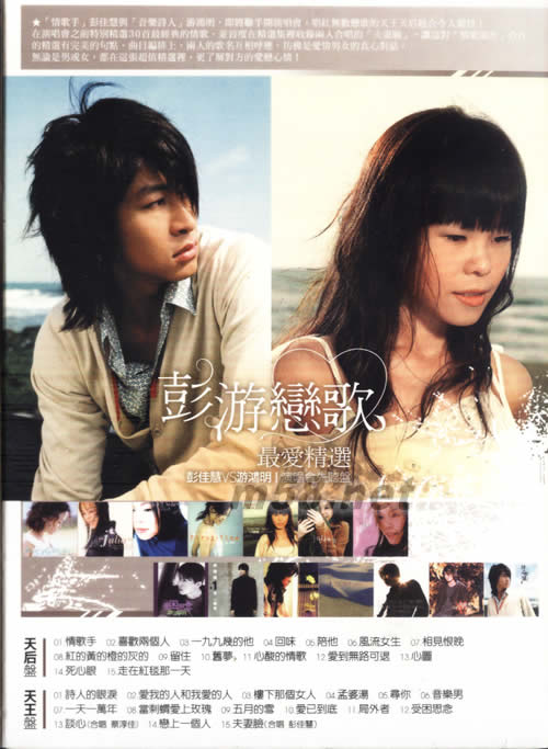 DISK 1 CD 天后盤-彭佳慧 1、情歌手 2. 喜歡兩個人 3. 一九九幾的他 4. 回味 5. 陪他 6. 風流女生 7. 相見恨晚 8. 紅的黃的橙的灰的 9. 留住 10. 舊夢 11. 心酸的情歌 12. 愛到無路可退 13. 心圖 14. 死心眼 15. 走在紅毯那一天 DISK 2 CD 天王盤-游鴻明 1、詩人的眼淚 2. 愛我的人和我愛的人 3. 樓下那個女人 4. 孟婆湯 5. 尋你 6. 音樂男 7. 一天一萬年 8. 當刺蝟愛上玫瑰 9. 五月的雪 10. 愛已到底 11. 局外者 12. 受困思念 13. 談心 (合唱 蔡淳佳) 14. 戀上一個人 15. 夫妻臉 (合唱 彭佳慧)