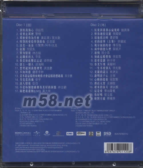 Disc 1(國) 01. 別怕我傷心 -張信哲 02. 愛要去那里 -黎明 03. 那么愛你為什么 -黃品源/莫文蔚 04. 特別的愛給特別的你 -伍思凱 05. 浪花一朵朵 -任賢齊/阿牛/光良 06. 征服 -柯受良 07. 單身情歌 -林志炫 08. 走鋼索的人 -李泉 09. 你是如此難以忘記 -梁朝偉 10. 戀上一個人 -游鴻明 11. 想哭就到我懷里哭 -庾澄慶 12. 不知所措 -優客李林 13. 是不是這樣的夜晚你才會這樣的想起我 -吳宗憲 14. 月亮惹的禍 -張宇 15. 浪人情歌 -伍佰 16. 不是每個戀曲都有美好的回憶 -林志穎 17. 你把我灌醉(LIVE) -黃大煒 Disc 2(粵) 01. 紅葉斜落我心寂寞時 -鐘鎮濤 02. 怪你過份美麗 -張國榮 03. 結他低泣時 -夏韶聲 04. 愛的故事(上集) -孫耀威 05. 幾分鐘的約會 -陳百強 06. 雨中的戀人們 -黃凱芹 07. 迷惘 -郭小霖 08. 如此這般想你 -張智霖 09. 最愛是誰 -林子祥 10. 春光乍洩 -黃耀明 11. 一生不愛別人 -李克勤 12. 美麗的謊言 -蔡濟文 13. 誰明浪子心 -王杰 14. 心酸的情歌 -巫啟賢 15. 酒店大堂 -吳國敬 16. 遲來的春天 -譚詠麟 17. 這是愛 -泰迪羅賓 18. 你好嗎 -張立基 19. 絕對空虛 -蔡楓華