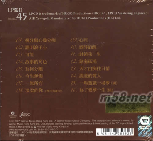 01. 幾分傷心幾分癡 02. 誰明浪子心 03. 可能 04. 故事的角色 05. 為何分離 06. 今生無悔 07. 一無所有 08. 溫柔的你 -王杰/林憶蓮合唱 09. 心痛 10. 酒醉酒醒 11. 封鎖我一生 12. 怒海孤鴻 13. 天才白癡往日情 14. 說謊的愛人 15. 一場游戲一場夢(國) 16. 為了愛夢一生(國)