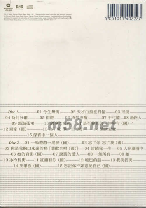 華納No.1系列 王杰(m58.net) 華納NO.1 發燒DSD碟裝系列共有: NO.1 曾路得 NO.1 林憶蓮 NO.1 蘇芮 NO.1 蔡琴 NO.1 林姍姍 NO.1 葉倩文 NO.1 陳潔靈 NO.1 陳百強 NO.1 夏韶聲 NO.1 呂方 NO.1 周啟生 NO.1 王杰 NO.1 林子祥 NO.1 BEYOND NO.1 太極