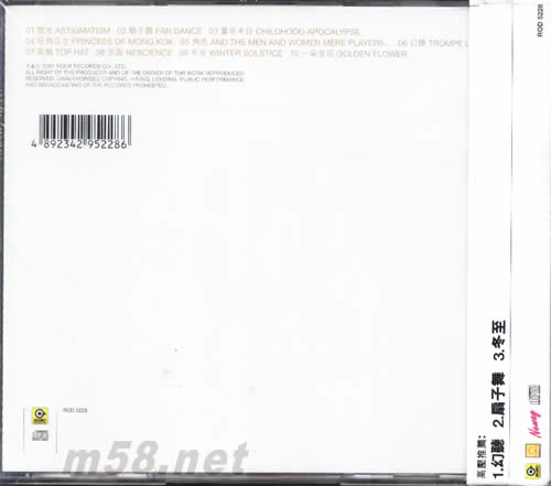01. 散光 ASTIGMATISM 02. 扇子舞 FAN DANCE 03. 童年末日 CHILDHOOD APOCALYPSE 04. 旺角公主 PRINCESS OF MONG KOK 05. 角色 AND THE MEN AND WOMEN MERE PLAYERS... 06. 幻聽 TROMPE L OREILLE 07. 高帽 TOP HAT 08. 忘我 NESCIENCE 09. 冬至 WINTER SOLSTICE 10. 一朵金花 GOLDEN FLOWER