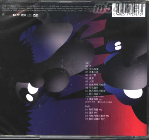 cd 01 大 02 有時寂寞 03 中毒太甚 04 主打愛 05 傻男 06 太悶 07 抱歉柯德莉夏萍 08 知我莫問 09 我的脆弱與堅強 10 最好給最好 11 隨夢而飛 DVD 01 有時寂寞 MV 02 傻男 MV 03 抱歉柯德莉夏萍 MV 04 最好給最好 MV