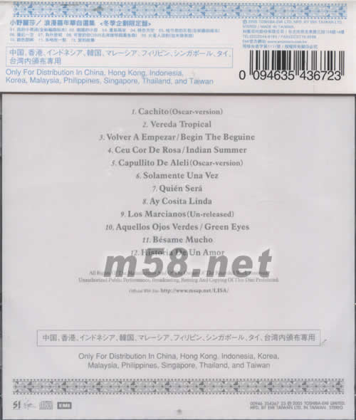 浪漫嘉年華自選集(臺(tái)版)(m58.net) 2005年小野麗莎連續(xù)推出以拉丁為主題的浪漫嘉年華3張系列作品,陪伴我們渡過(guò)了充滿(mǎn)熱帶風(fēng)情的一季。迎接新的年度的來(lái)臨,小野麗莎特別從浪漫嘉年華vol.1、vol.2、vol.3 這3張作品中精選出各自最具代表的人氣歌曲,經(jīng)過(guò)重新編曲后呈現(xiàn)出全新風(fēng)貌的[Cachito 我的小男孩]、[Capullito De Aleli 桂竹香的花苞]及年度熱門(mén)話題左岸咖啡館廣告曲[Ay Cosita Linda 可愛(ài)的你]…等及限定盤(pán)追加從未發(fā)表曲目[Los Marcianos 火星人派對(duì)]共12首作品