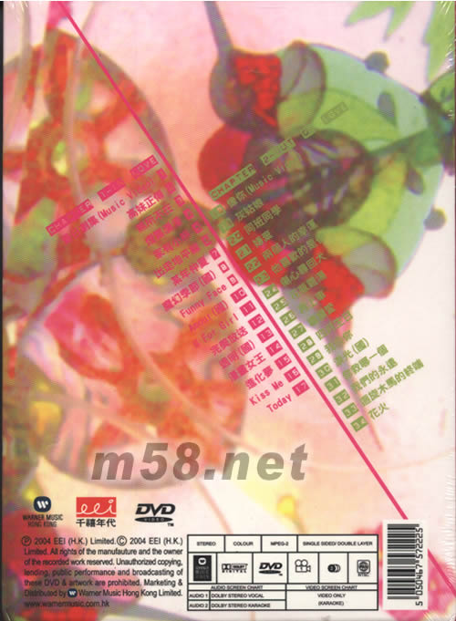 價格為估,以實(shí)到貨為準(zhǔn)! 我鐘意梁詠琪 精選 卡拉OK DVD(m58.net) 杜比立體聲DVD 具體參數(shù)請點(diǎn)看產(chǎn)品正、背面大圖