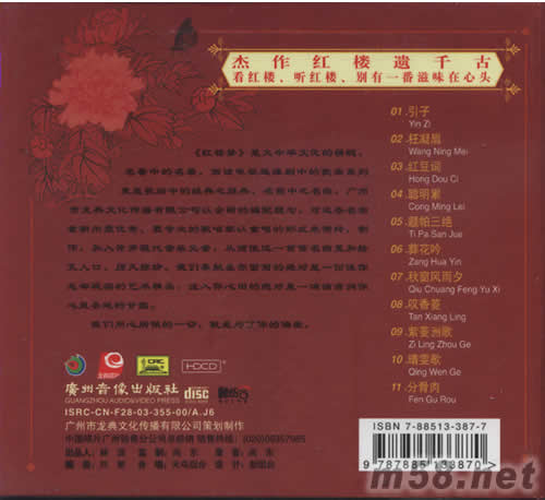 價格為估,以實到貨為準! 紅樓夢(m58.net) 《紅樓夢》是大中華文化的精髓,名著中的名著,而該電視連 續劇中的歌曲系列更是歌壇中的經典之經典,名曲中之名曲。廣州市龍典文化傳播有限公司以金新的編配理念,對這些名曲重新用最優秀,最專業的歌唱家以重唱的形式來演繹,制作,回入許多現代音樂元素,從而使這一首首名曲更回膾炙人口,歷久彌珍。我們奉獻在你面前的絕對是一份使你忘卻現實的藝術精呂,注入你心田的絕對是一滴滴滋潤你心靈對地的甘露。 我們用心所做一切,就是為了你的偏愛。