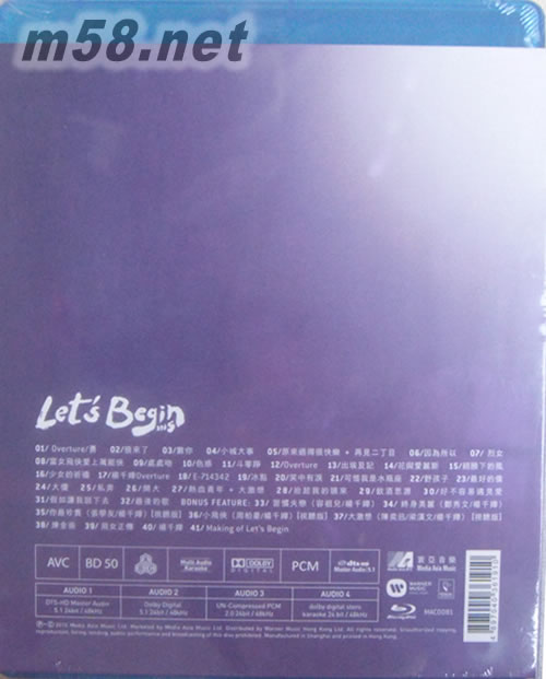 Let’s Begin Concert 2015 世界巡迴演唱會 Live (Blu-ray)(m58.net) 特別收錄: Making of Let’s Begin 製作花絮 煉金術 / 飛女正傳 / 楊千嬅 細胞分裂再重組 脫胎換骨Let's Begin 二十年major minor classics 盡出 最刻骨銘心的楊千嬅式情歌 回憶滿載 一次公開