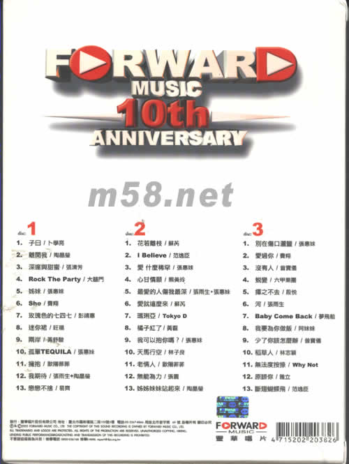 1 1、子日/卜學亮 2、離開我/陶晶瑩 3、深邃與甜蜜/張清芳 4、ROCK THE PARTY/大喜門 5、姐妹/張惠妹 6、SHE/費翔 7、玫瑰的七四七/彭靖惠 8、迷你裙/旺福 9、兩岸/黃舒駿 10、孤單TEQUILA/張惠妹 11、擁抱/歐陽菲菲 12、我期待/張雨生+陶晶瑩 13、戀戀不舍/易 2 1、花若離枝/蘇芮 2、I BELIEVE/范逸臣 3、愛什么稀罕/張惠妹 4、心甘情愿/熊美玲 5、最愛的人傷我最深/張雨生+張惠妹 6、愛就這么來/蘇芮 7、瑪利亞/TOKYO D 8、橘子紅了/黃磊 9、我可以抱你嗎?/張惠妹 10、天馬行空/林子良 11、老情人/歐陽菲菲 12、無能為力/張震 13、姐姐妹妹站起來/陶晶瑩 3 1、別在傷口灑鹽/張惠妹 2、愛過你/費翔 3、沒有人/曾寶儀 4、蛻變/六甲樂團 5、揮之不去/ 殷悅 6、河/張雨生 7、BABY COME BACK/夢飛船 8、我要為你做飯/阿妹妹 9、少了你該怎么辦/曾寶儀 10、稻草人/林志穎 11、無法度按捺/WHY NOT 12、原諒你/雅立 13、斷翅蝴蝶飛/范逸臣