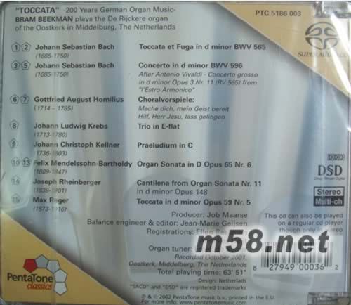 史上200年最著名的管風琴音樂 SACD(m58.net) 《史上200年最著名的管風琴音樂》這是一張包括有巴赫的托卡塔/霍米柳斯/克伯斯/科林納/柏瑞斯迪/雷戈爾/等人的著名管風琴作品!管風琴的音色純凈而深沉,氣勢宏大,尤其是教堂里的演奏更添光彩!貝克曼演奏