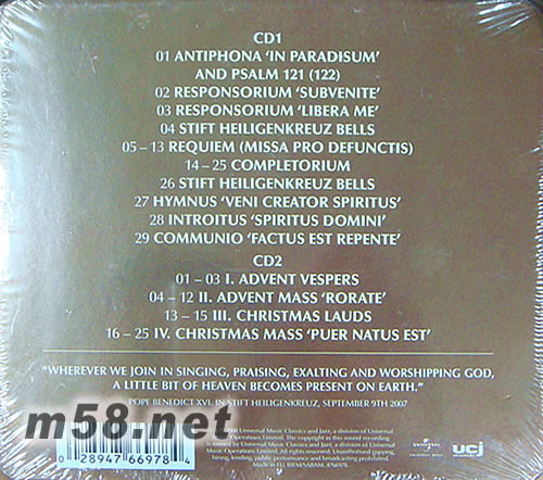 1.Antiphon "In Paradisum"And Psalm121(122) 2.Responsorium "Subvenite" 3.Responsorium "Libera Me" 4.Stift Heiligenkreuz Bells 5-13.Requiem( Missa Pro Defunctis) 14-25.Completrium 26.Stift Heiligenkreuz Bells 27.Hymnus "Veni Creator Spiritus" 28.Introi"Spiritus Domini" 29.Communio"Factus Est Repente" CD2 1-3.ADVENT VESPERS 4-12.ADVENTMASS RORATE 13-15.CHRISTMAS LAUDS 16-25.CHRISTMAS MASS PUER NATUS EST