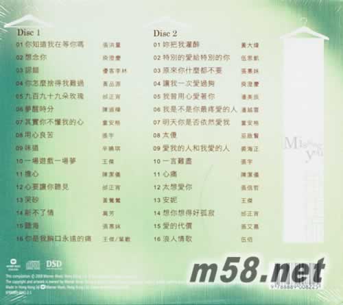 CD 1 01. 你知道我在等你嗎? - 張洪量 02. 想念你 - 庾澄慶 03. 認錯 - 優客李林 04. 你怎麼捨得我難過 - 黃品源 05. 九百九十九朵玖瑰 - 邰正宵 06. 夢醒時份 - 陳淑樺 07. 其實你不懂我的心 - 童安格 08. 用心良苦 - 張宇 09. 味道 - 辛曉琪 10. 一場游戲一場夢 - 王杰 11. 擔心 - 陳潔儀 12. 心要讓你聽見 - 邰正宵 13. 哭砂 - 黃鶯鶯 14. 新不了情 - 萬芳 15. 聽海 - 張惠妹 16. 你是我胸口永遠的痛 - 王杰/葉歡 CD 2 01. 你把我灌醉 - 黃大偉 02. 特別的愛給特別的你 - 伍思凱 03. 原來你什麼都不要 - 張惠妹 04. 讓我一次愛過夠 - 庾澄慶 05. 我曾用心愛著你 - 潘美辰 06. 我是不是你最疼愛的人 - 潘越云 07. 明天你是否依然愛我 - 童安格 08. 太傻 - 巫啟賢 09. 愛我的人和我愛的人 - 裘海正 10. 一言難盡 - 張宇 11. 心痛 - 陳潔儀 12. 太想愛你 - 張信哲 13. 安妮 - 王杰 14. 想你想得好孤寂 - 邰正宵 15. 愛的代價 - 張艾嘉 16. 浪人情歌 - 伍佰