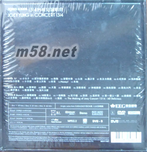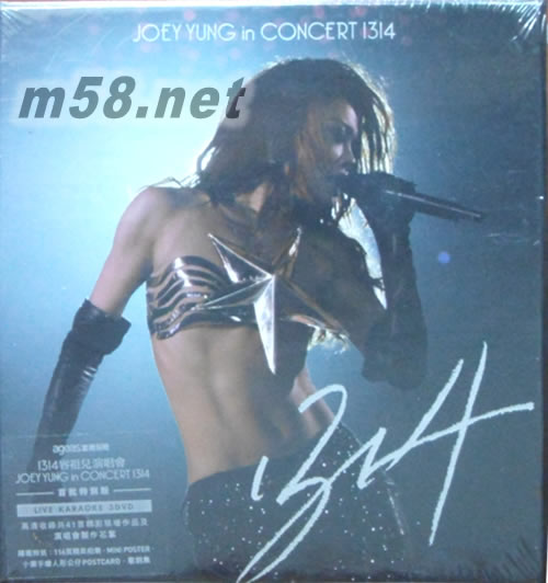 1314 容祖兒演唱會 Live Karaoke (3DVD)(m58.net) 天后容祖兒闊別三年再踏紅館,首次舉行跨年紅館演唱會,《1314容祖兒演唱會》由2013年圣誕唱到2014除夕和新年,共開15場成功破她個人演唱會紀錄。個唱以「一生一世」為主題,Joey載歌載舞與樂迷一起歡渡佳節,以情人節、復活節、母親節、生日、中秋節、萬圣節和圣誕節等不同節日的環節唱跳超過40首經典金曲。 《1314容祖兒演唱會》以三碟裝DVD發行,碟內特別收錄個唱制作特輯。隨碟附送: 十款手繪演唱會主題服裝造型紀念冊 116頁演唱會相集 迷你海報 歌詞集