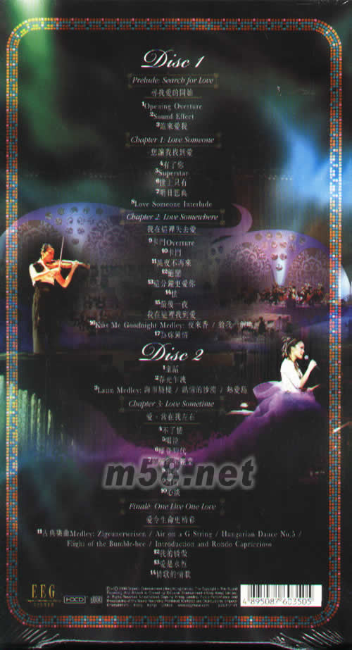 CD1 鈴聲 試聽 試睇 1 Opening Overture 2 Sound Effect 3 誰來愛我 4 有了你 5 Superstar 6 世上只有 7 明日恩典 8 Love Someone Interlude 9 卡門 overture 10 卡門 11 黑夜不再來 12 絕戀 13 這分鐘更愛你 14 怯 15 最後一夜 16 Kiss Me Goodnight Medley: 夜來香 / 給我一個吻 17 為你鍾情