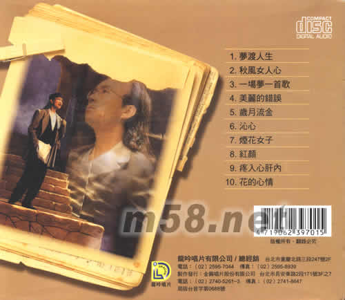 1、夢渡人生 2、秋風女人心 3、一場夢一首歌 4、美麗的錯誤 5、歲月流金 6、沁心 7、煙花女子 8、紅顏 9、疼入心肝內 10、花的心情