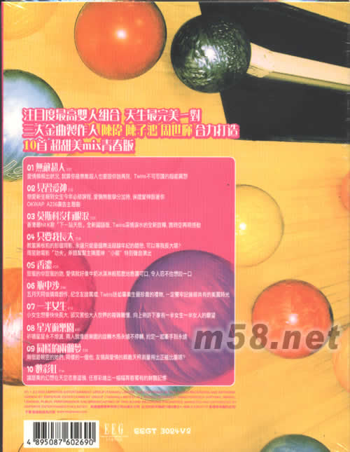 CD - 5首新歌 + 5首粵語改編歌 01. 無敵超人 愛情頻頻出狀況,就算你是無敵超人也要跟你說再見,Twins不可思議的超能異想 02. 見習愛神 戀愛新生報到女生今年必修課程,愛情無敵學分加持,保證愛神跟著你 03. 莫斯科沒有眼淚 香港最hit K歌[下一站天后]全新國語版,Twins深情淚水的全新詮釋,跨時空再現感動 04. 只要我長大 教室黑板前的那個背影,永遠只能是個無法超越年紀的暗戀,可以等我長大嗎?周星馳電影[功夫]斧頭幫幫主陳國坤"小龍"特別聲音演出 05. 香濃 甜蜜的你甜蜜的吻,愛情就好像牛奶冰淇淋般那么地香濃可口,令人忍不住想咬一口 06. 瓶中沙 五月天阿信情商創作,紀念友誼萬歲,Twins送給畢業生最珍貴的禮物,一定要牢記曾經共有的美麗時光 07. 一半女生 小女生想要快快長大,卻又害怕大人世界的復雜難懂,向上帝許下享有一半女生一半女人的愿望 08. 星光游樂園 祈禱星星永不熄滅,兩人就像游樂園的旋轉木馬永遠不停轉,約定一起牽手到永遠 09. 同樣的兩個夢 兩個最親密的她們,同樣的一個他,友情與愛情的兩難天平測量得出正確比重嗎? 10. 數彩虹 讓甜美的幻想在天空恣意涂鴉,任意彩繪出一幅幅青春獨有的鮮艷記憶
