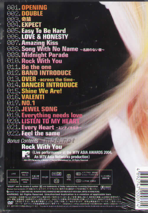 1 Opening 2 Double 3 奇蹟 4 Expect 5 Easy To Be Hard 6 Love & Honesty 7 Amazing Kiss 8 Song With No Name ~名前のない歌~ 9 Midnight Parade 10 Rock With You 11 Be The One 12 Band Introduce 13 Over~across the time~ 14 Dancer ntroduce 15 Shine We Are! 16 Valenti 17 No.1 18 Jewel Song 19 Everything Needs Love 20 Listen To My Heart 21 Every Heart 22 Feel The Same Bonus Contents Rock With You (Live performance at the MTV ASIA AWARDS 2004. An MTV Asia Networks production)