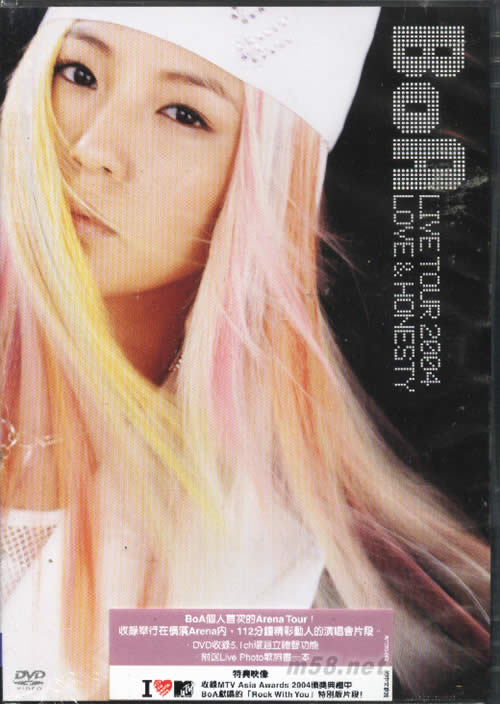 BOA LIVE TOUR 2004 LOVE HONESTY(海外版DVD)(m58.net) BoA 個人首次的 Arena Tour! 收錄舉行在橫濱 Arena 內, 112 分鐘精彩動人的演唱會片段 .DVD收錄5.1ch環回立體聲功能 .附送Live Photo歌詞書一本