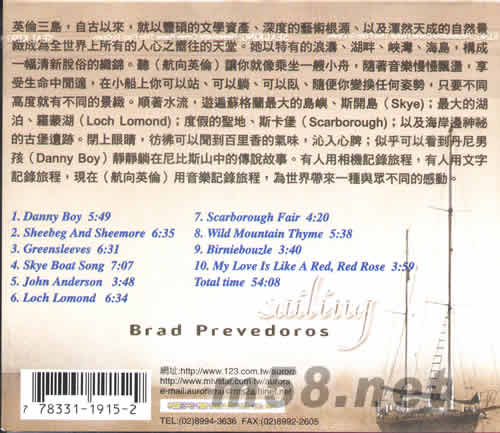 1、DANNY BOY 2、SHEEBEG AND SHEEMORE 3、GREENSLEEVES 4、SKYE BOAT SONG 5、JOHN ANDERSON 6、LOCH LOMOND 7、SCARBOROUGH FAIR 8、WILD MOUNTAIN THYME 9、BIRNIRBOUZLE 10、MY LOVE IS LIKE ARED,RED ROSE TOTAL TIME