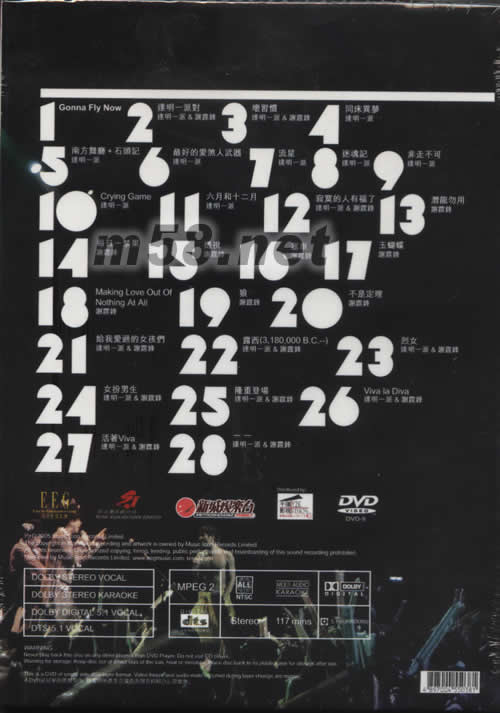 01. Gonna Fly Now 02. 達明一派對 -達明一派&謝霆鋒 03. 壞習慣 -達明一派&謝霆鋒 04. 同床異夢 -達明一派 05. 南方舞廳+石頭記 -達明一派 06. 最好的愛煞人武器 -達明一派 07. 流星 -達明一派 08. 迷魂記 -達明一派 09. 非走不可 -達明一派 10. Crying Game -達明一派 11. 六月和十二月 -達明一派 12. 寂寞的人有福了 -達明一派&謝霆鋒 13. 潛龍勿用 -謝霆鋒 14. 每日一禁果 -謝霆鋒 15. 透視 -謝霆鋒 16. 塞車 -謝霆鋒 17. 玉蝴蝶 -謝霆鋒 18. Making Love Out Of Nothing At All -謝霆鋒 19. 狼 -謝霆鋒 20. 不是定理 -謝霆鋒 21. 給我愛過的女孩們 -達明一派&謝霆鋒 22. 露西(3,180,000 B.C.--) -達明一派&謝霆鋒 23. 烈女 -達明一派&謝霆鋒 24. 女扮男生 -達明一派&謝霆鋒 25. 隆重登場 -達明一派&謝霆鋒 26. Viva la Diva -達明一派&謝霆鋒 27. 活著Viva -達明一派&謝霆鋒 28. - - -達明一派&謝霆鋒