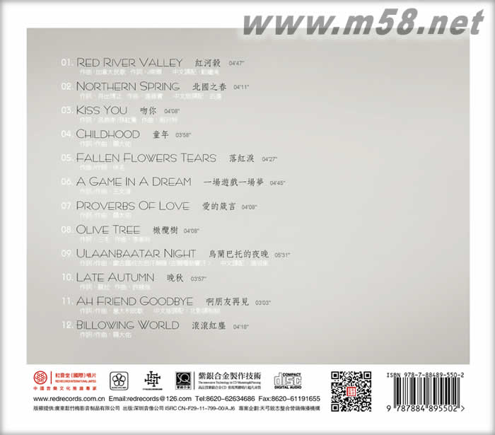 01.紅河谷 Red River Valley 想念心中的故鄉(xiāng),想你夢(mèng)中的姑娘,為了生活暫時(shí)的離開,你不要傷心不要難過,有你在遠(yuǎn)方深情的呼喚我,每一刻都是屬於我的快樂。 02.北國(guó)之春 Northern Spring 作於1977年的《北國(guó)之春》是一首日本民謠式歌曲,日文原唱歌曲的歌手是千昌夫,歌曲描寫了日本中部地區(qū)長(zhǎng)野縣一帶的景致,更是對(duì)家鄉(xiāng)和親人的萬千思念。 03.吻你 Kiss you 如草原的情深炙熱感人肺腑,如草原的傾訴心聲收放自如,優(yōu)美中略帶淡淡的哀愁,典雅細(xì)膩含蓄的音樂美,匯集成一幅壯美的草原詩(shī)畫。 04.童年 Childhood 童年,就像五彩繽紛的夢(mèng),醒來還是那樣清晰,讓人回味無窮。童年,就像五彩斑斕的珍珠,串連起無盡的歡樂與稚嫩的夢(mèng)想。 05.落紅淚 Fallen flowers tears 如果情可以割捨,如果愛可以昇華,為何道別后心還是止不住的難過?為何祝福后淚還是止不住的流淌?獨(dú)特的聲線感性而熾熱點(diǎn)滴之間從心底里感動(dòng)。 06.一場(chǎng)游戲一場(chǎng)夢(mèng) A game in a dream 孤單的背影,茫然的情緒,悲苦的愛情,受傷的心靈,感情濃得化不開,背影比誰都孤單,游戲終將是一場(chǎng)夢(mèng)。 07. 愛的箴言 Proverbs of Love 愛是感天動(dòng)地,所以才有如此之深刻箴言,愛是刻骨銘心,所以才會(huì)如此之佈滿傷痕,愛了就不要后悔,付出更不要沉醉。 08.橄欖樹 Olive tree 流浪的腳步從未歇息停留,從這一邊到那邊的地平線,只是還有天涯孤旅的鄉(xiāng)愁,和漂泊的身影如風(fēng)的眼眸。 09.烏蘭巴托的夜晚 Ulaanbaatar night 沒有到過烏蘭巴托的人,永遠(yuǎn)不知道那里的夜晚是如此動(dòng)人,凝視頭上高掛的月亮,仿若身在月宮與嫦娥對(duì)飲,滿天的星光都在閃爍陪襯。 10.晚秋 Late autumn 風(fēng)不解,雨綿綿;曲飄然,夜含煙;一個(gè)字,幾生緣;夜無言,淚吹散;秋意濃,夢(mèng)已遠(yuǎn)。 11.啊朋友再見 Ah friend goodbye 《啊朋友再見》外文曲名為“ Bella ciao ”,原唱為Yves Montand,是電影《橋》的主題曲,歌曲聲音委婉連綿曲折優(yōu)美步步高昂,讚頌了革命游擊隊(duì)的大無畏的英雄氣概,表現(xiàn)了革命游擊隊(duì)視死如歸的精神和品質(zhì)。 12.滾滾紅塵 Billowing world 率性中透著柔情,回應(yīng)著一往情深,俯瞰蕓蕓眾生,無盡悲天憫人,耳畔心間世間情懷,滄海桑田過眼云煙。